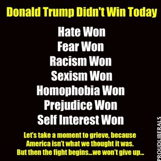 Well the unthinkable has happened, at least for me and my ilk. We have a racist, sexist, xenophobic, homophobic, hate mongering man as president elect, who will be appearing in court for child rape charges, fraud charges and racketeering charges, and who refused to release his taxes, a 40 year old tradition. All this was well known, yet people still voted for him. That’s a story for another time. My point here is what happens now? Do Hispanics get thrown out? Will there really be a wall built? Climate change control is surely out the window. Obamacare will be defunded. Goodbye keeping your children on your insurance plan till age 26 and goodbye for not being denied due to a preexisting condition.